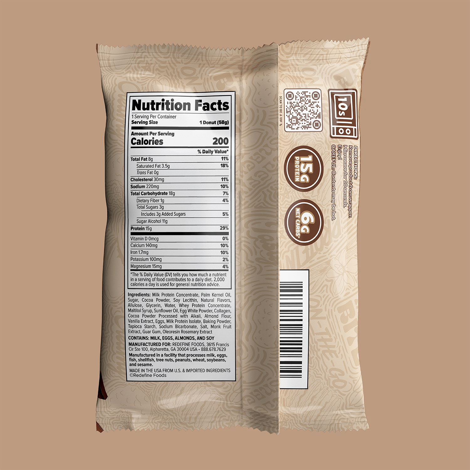 Satisfy your chocolate cravings with Redefine Foods™ Protein Donut, a rich, chocolate-glazed delight inspired by classic breakfast treats. Packed with 15g of premium protein per donut and made with no artificial ingredients, it's the perfect high-protein indulgence!