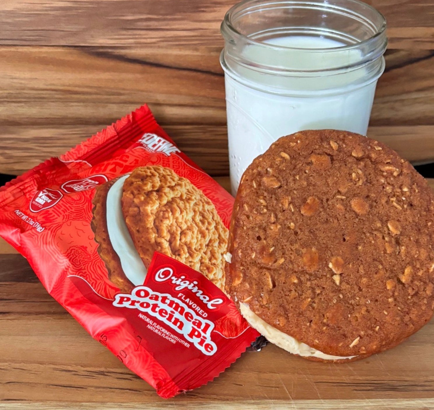 Meet the Oatmeal Protein Pie®: a unique, naturally flavored, non-GMO protein cookie with 14g protein, 12g fiber per pie! Enjoy the irresistible handmade flavor of oatmeal cookies hugging a marshmallow cream filling. You won't believe a healthy treat tastes this good!
