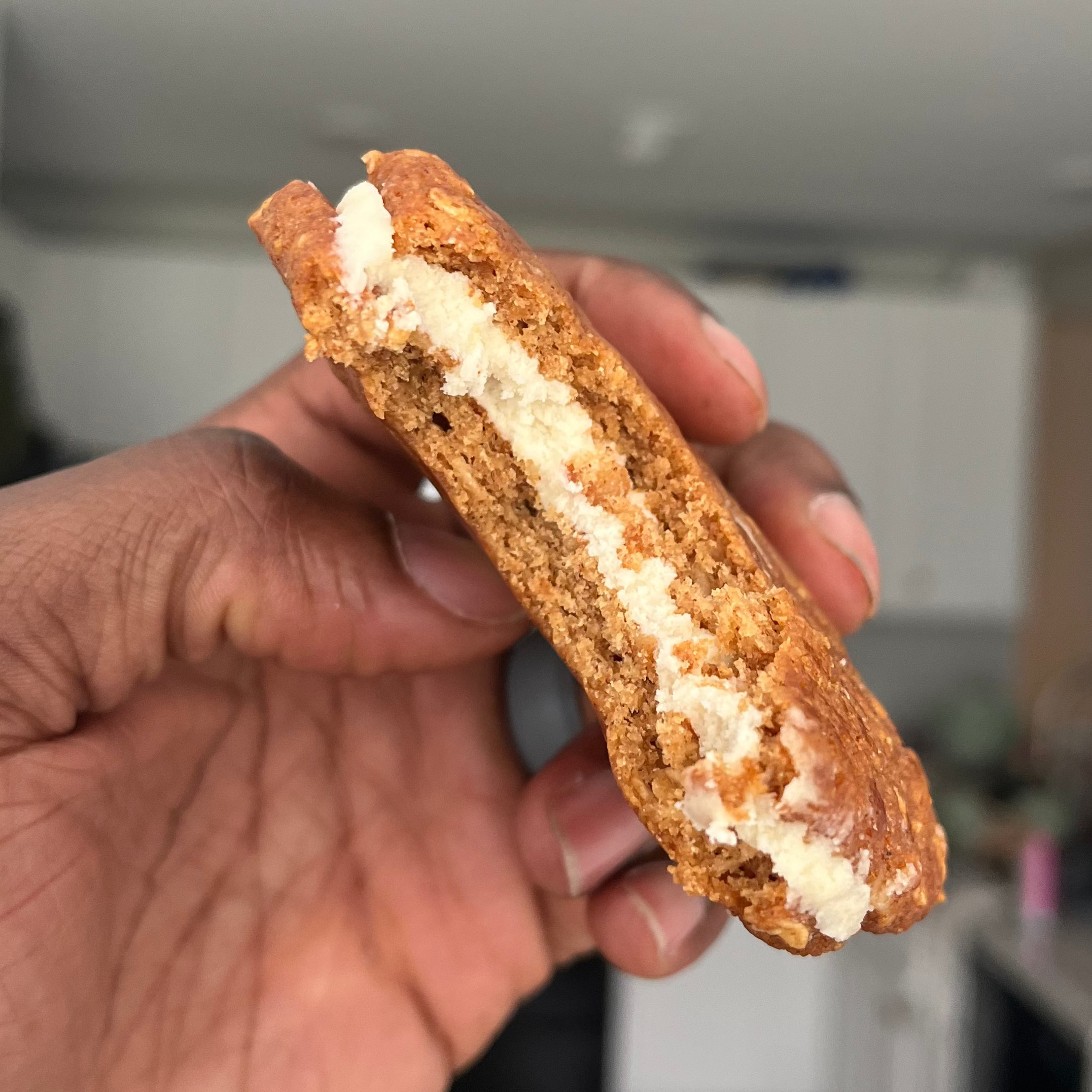 Once the cookies cool, we spread a fluffy, creamy protein filling between them. This gives the pie its signature “oatmeal crème sandwich” taste but with added protein and less sugar.
