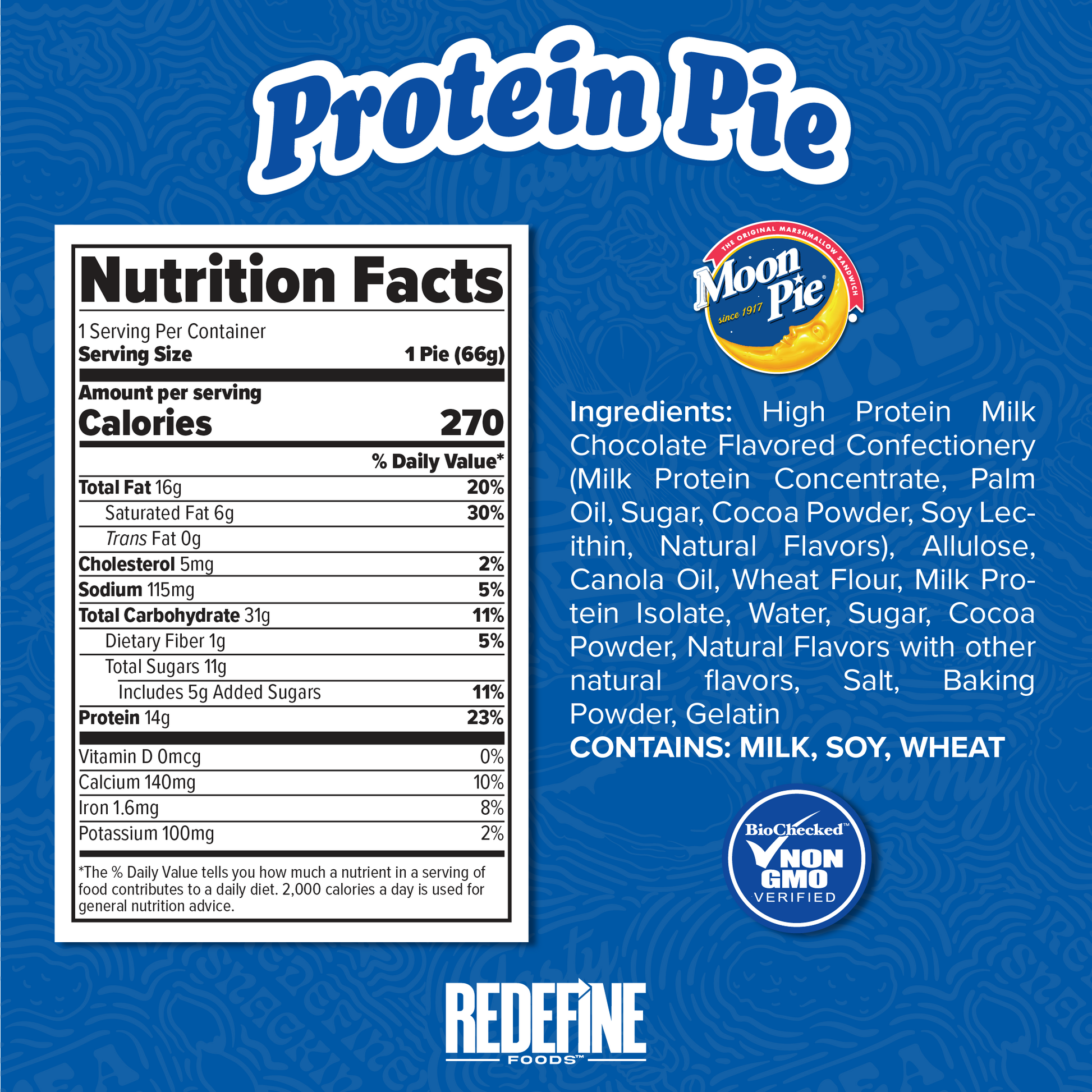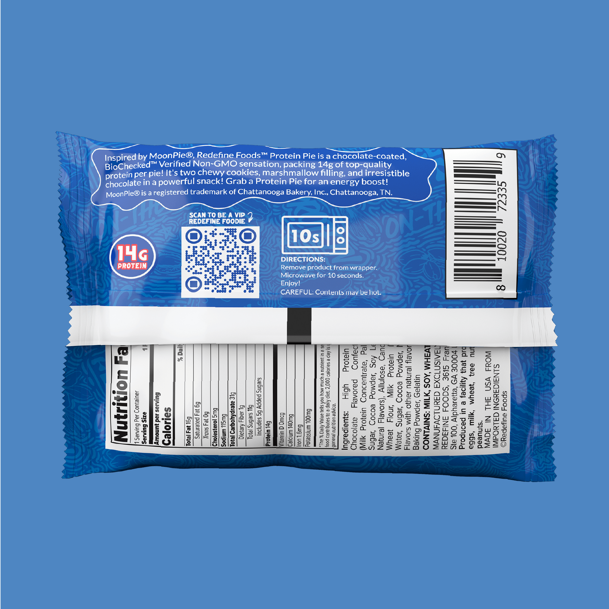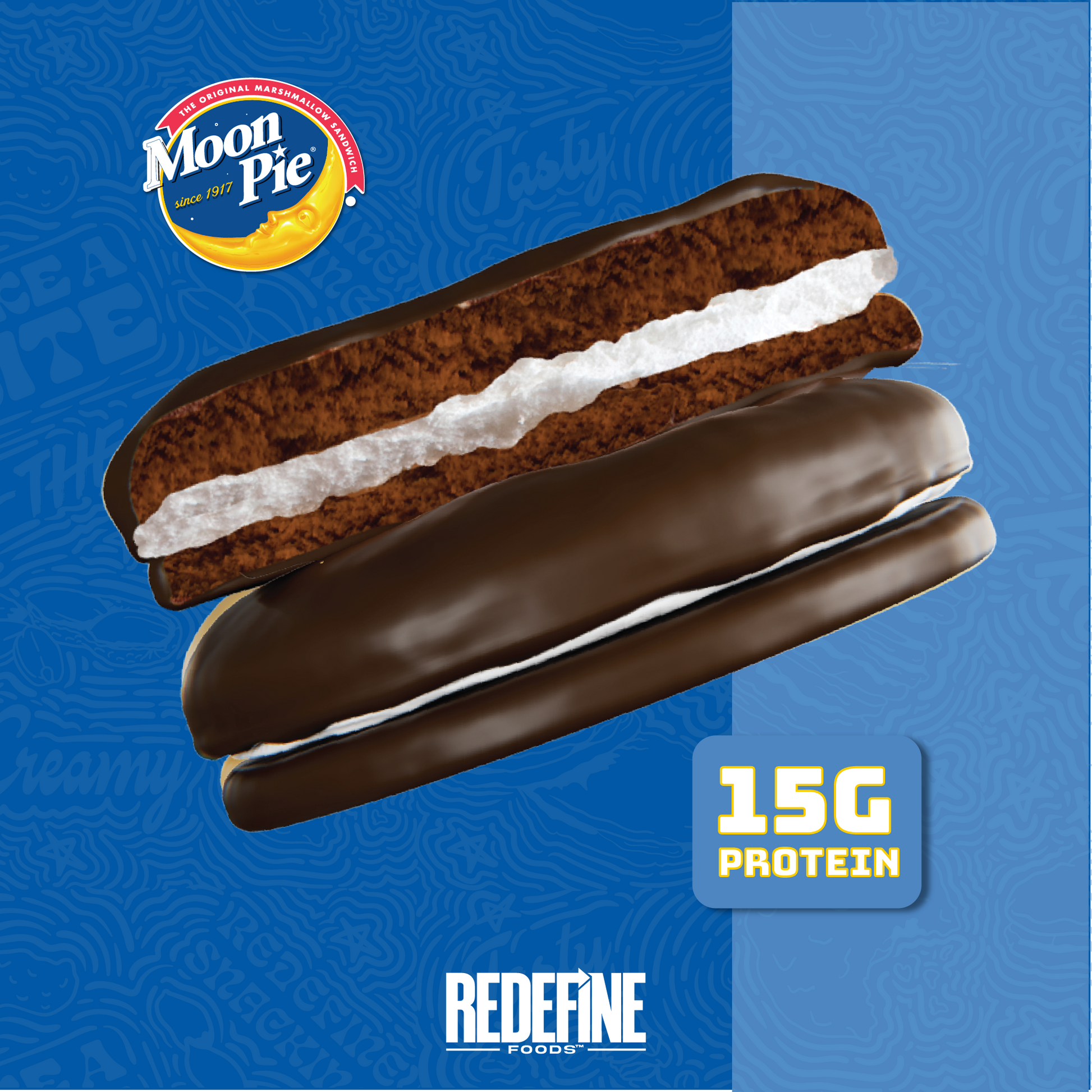 Inspired by MoonPie®, Redefine Foods™' Protein Pie is a coated, Non-GMO sensation, packing 14g of top-quality protein per pie! It's two chewy cookies, marshmallow filling, and irresistible chocolate in a powerful snack!